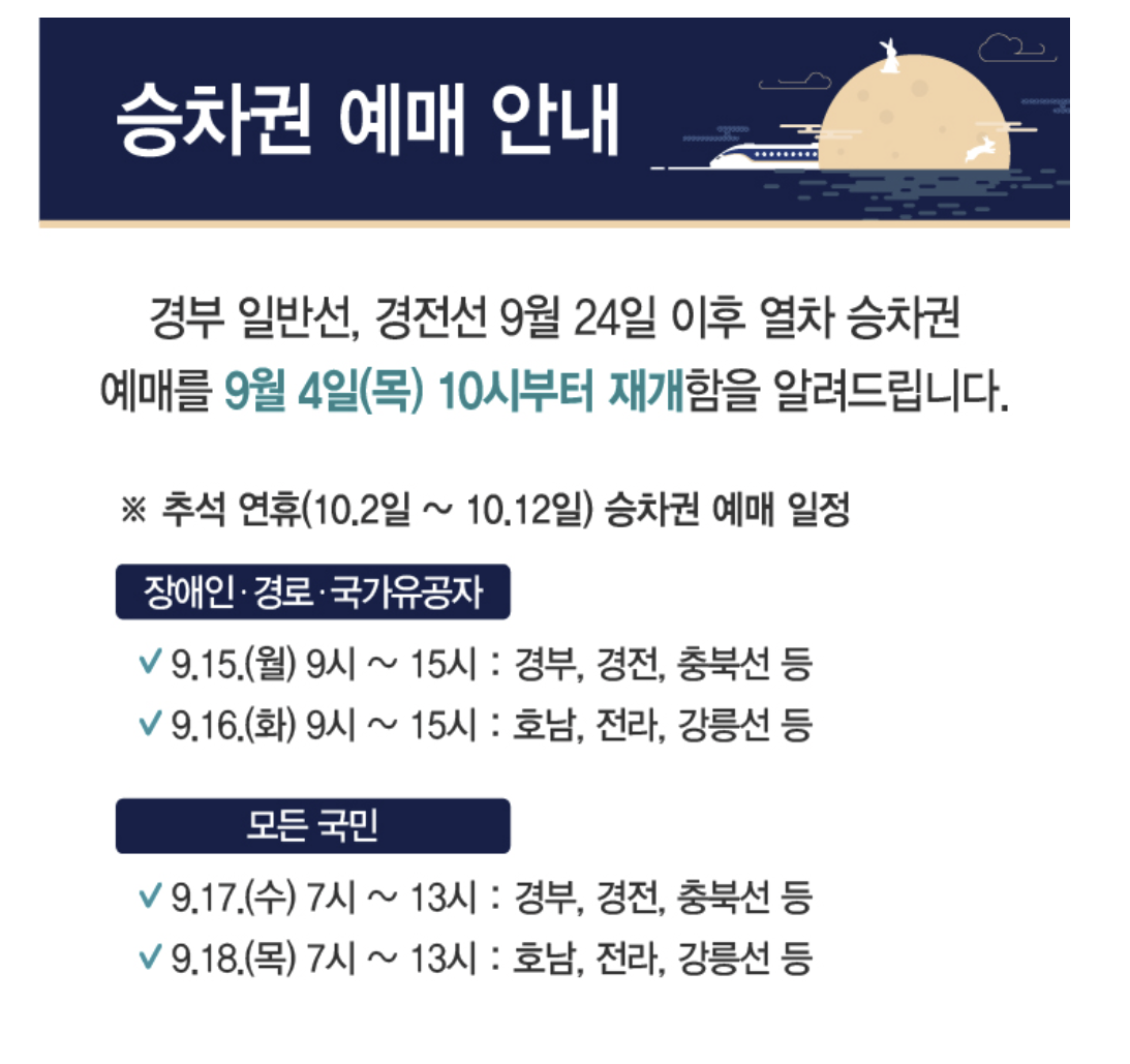 | 일반 예매 | 9월 10일(수) | 07:00~13:00 | 경부선, 경전선, 동해선 | 전 국민 | 홈페이지 전용 |